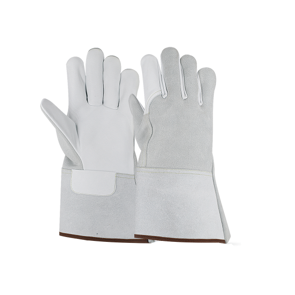 Leather: Goatskins leather palm   Colour: Natural Thumb: Wing thumb, Index finger Additional: Natural cow split leather back & cuff,  Brown cotton hem